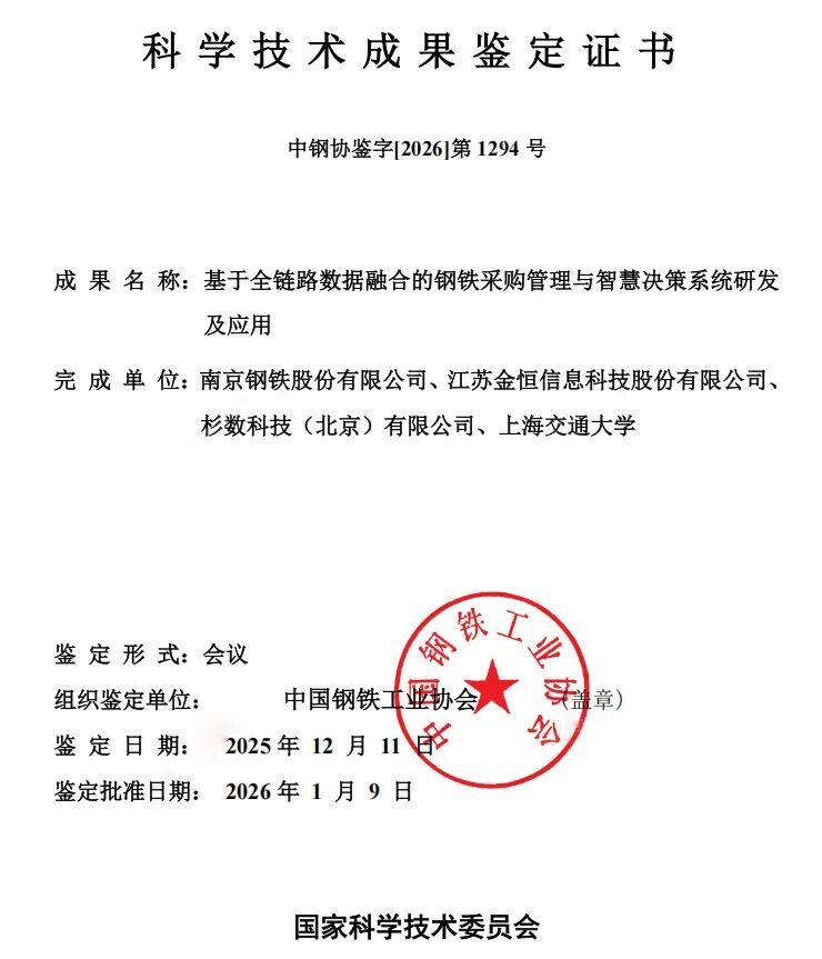 近日,中国钢铁工业协会正式批准了由南京钢铁股份有限公司、江苏金恒信息科技股份有限公司、杉数科技(北京)有限公司及上海交通大学联合研发的“基于全链路数据融合的钢铁采购管理与智慧决策系统”科技成果鉴定,评价结果为整体技术达到国际领先水平。该系统凭借显著的应用成效通过权威专家评审,标志着南钢采购数字化、智能化升级迈出关键一步。
